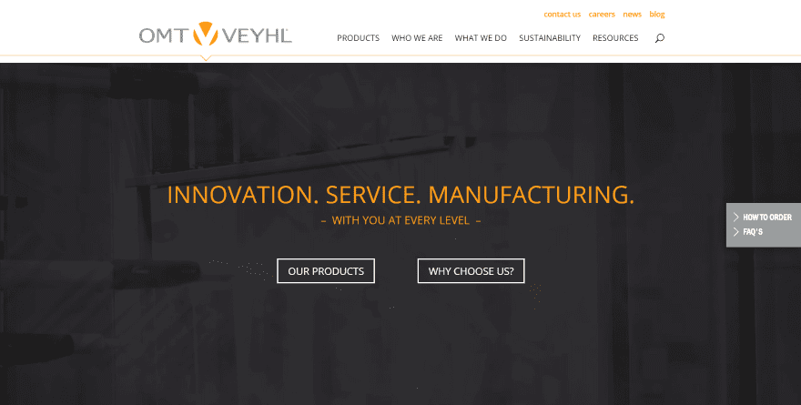 This site was submitted by Jonathan Mast. A line under the menu shows a small arrow that moves to the menu item you’re hovering over. The hero area shows a video to demonstrate the manufacturing process behind a dark overlay. Bold yellow text provides a tagline. This same yellow is used as titles and as the background for the footer. The next sections provide a single column of text and a pair of CTA’s over a styled background pattern.