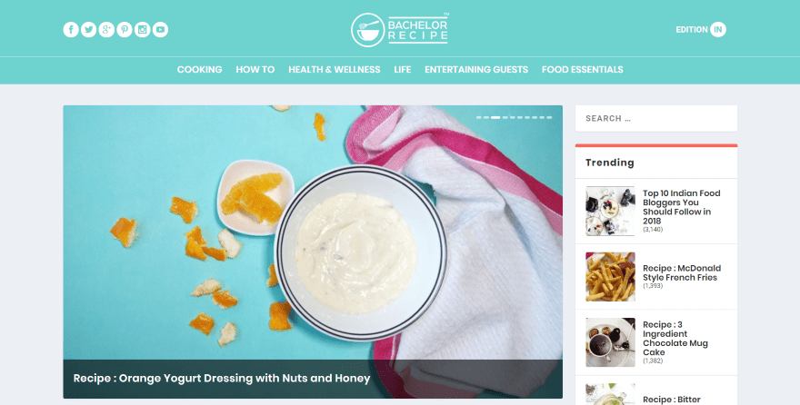 This site was submitted by Jaykishan Prithiani. This is a recipe magazine made with Extra. The header places social buttons on the left, the logo in the center, and a button to choose your country on the right. Links are placed below that. The homepage displays posts in a multi-column layout and a sidebar to take advantage of Extraβs widgets. The slider displays the latest posts followed by two columns for categories, a single column for the shop, three columns for more categories, and a single column with tabbed posts. The pages for each category display posts without excerpts, creating a clean design.