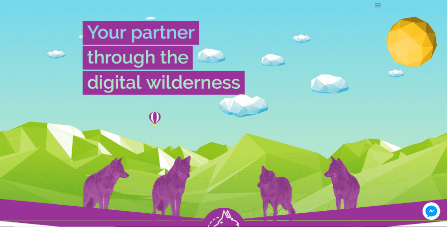 This site was submitted by Joel Whitaker. It uses some interesting links in the hero section that appear when you hover over the balloon or over the wolves. The clouds move in the opposite direction of your mouse as you move around. This site has one of the most interesting section dividers that Iβve seen. Itβs a thick purple downward arrow with a large logo in the center. An even larger version of this arrow is used as sections throughout the page. I like the use of purple and green within the sections, icons, and the two-sided button.