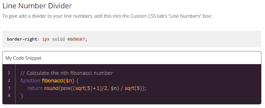 The code snippet display area can even be styled with CSS. The documentation includes some styling examples. This is one of the examples provided.