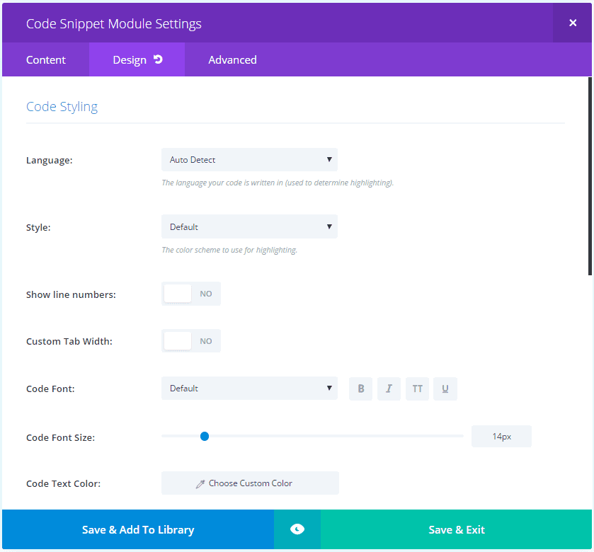 The module includes the code box in the Content tab. The Design tab has lots of settings for code styling. Settings include language (for highlighting), style (the color scheme), show numbers, custom tab width, and lots of font styles. It also includes the standard heading and border styling.