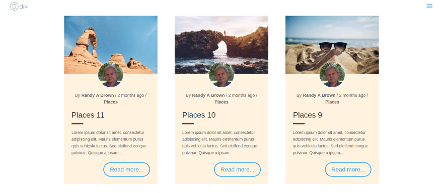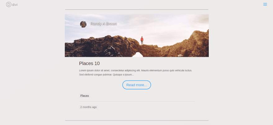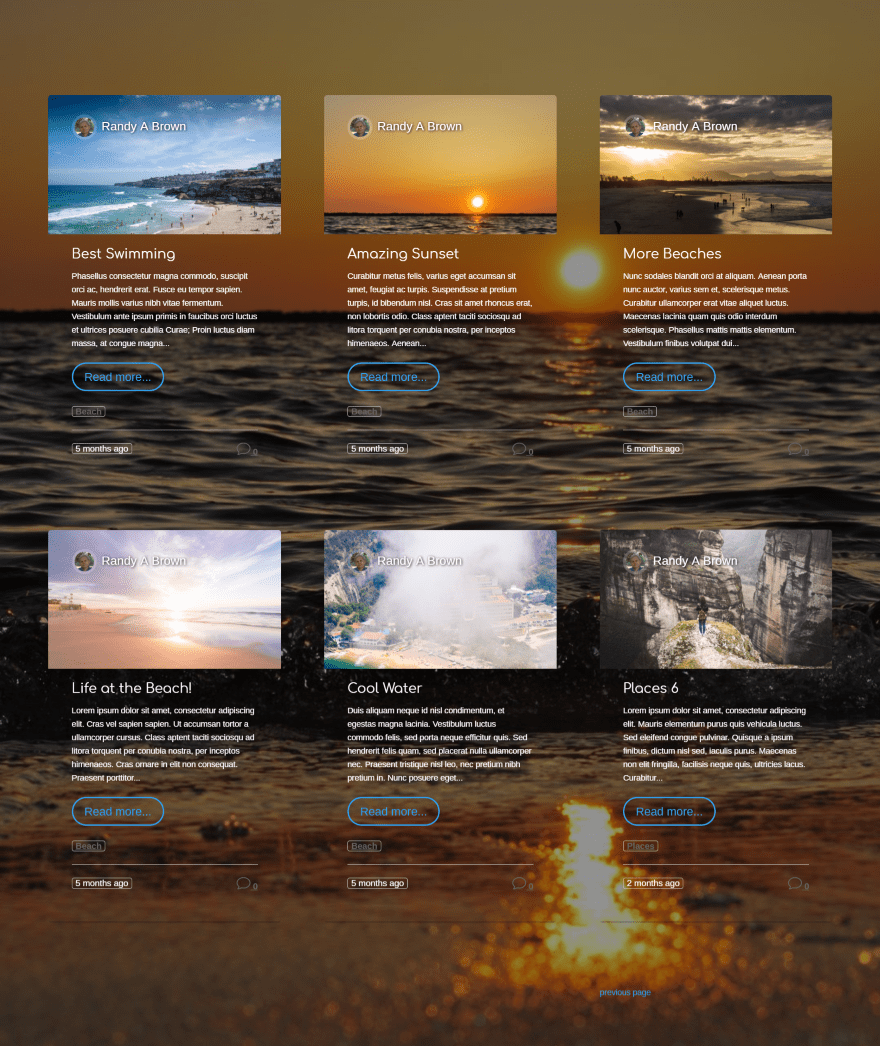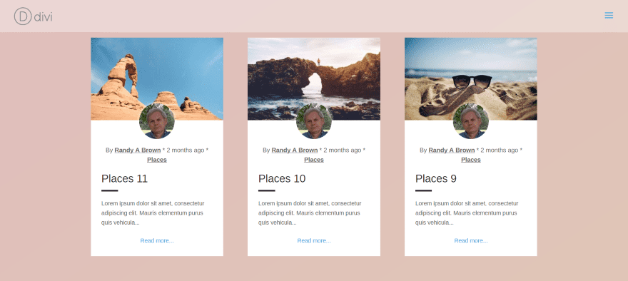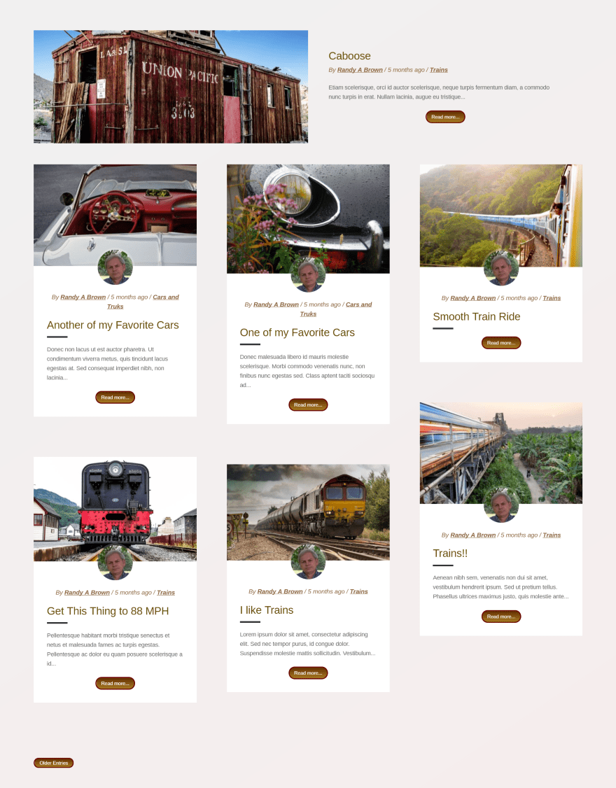 The default settings displays the featured image with the author’s Gravatar overlapping the bottom of the image. This is followed by the post meta, title, a line, post excerpt, and read more button with hover animation. I’ve added a background in the section to help it stand out.