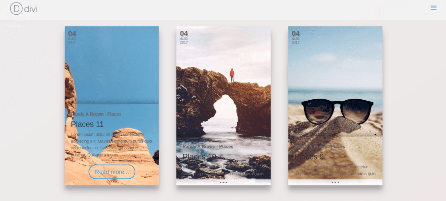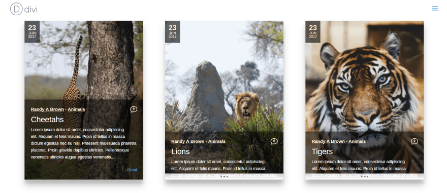 Of course an overlay does look good. I’ve added a black overlay and changed the opacity so a little bit of the image shows through. The date in the upper left corner also uses the overlay. I changed the button to text and moved it to the right. I like those three dots and line at the bottom of the cards. It’s a small detail that adds a touch of visual flare.