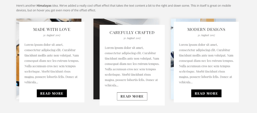 This is Himalayas, a 3-column, vertical layout that uses the post’s featured image as the background. It also uses button animation. This text is more difficult to see without adjustments. We’ll fix this later with an overlay.