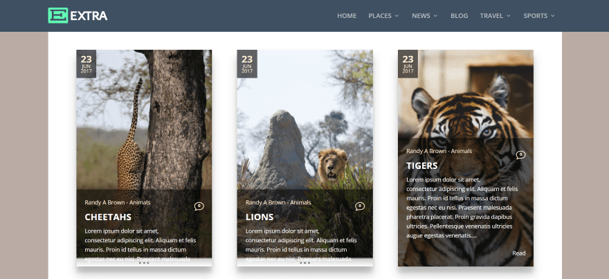 I love the look of Rockies. It has a nice shadow effect with hover animation that brings up the text and read more button. I could have placed a text overlay but I didn’t want to cover the image. Instead, I changed the text to light. I also changed the colors of meta and the button, and changed the separator to a dash.