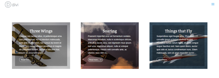 Here’s a look at the normal single column design. I’ve also added a hover overlay. Everything else is default.