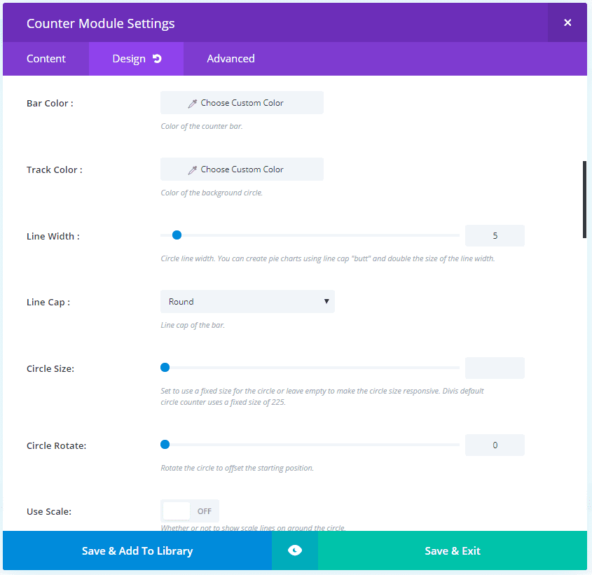 Choosing Circle in the Content tab adds a few circle options to the Design tab. Here you can adjust the line width, line cap, track color, etc.