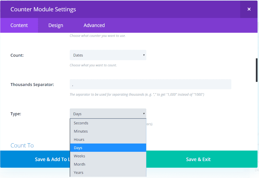 Dates adds the type of date to count. Choose between seconds, minutes, hours, days, weeks, months, and years.
