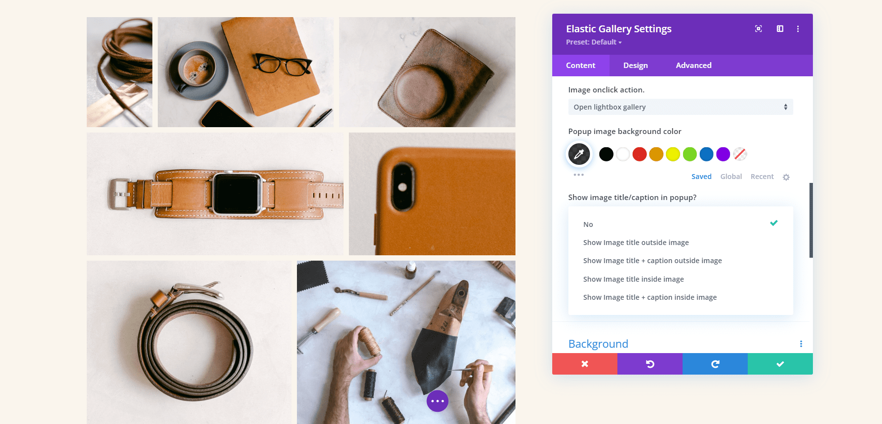 The Elastic Gallery Module includes all the standard Divi settings, allowing you full control over the styling of each element. Here’s a look at the main settings.