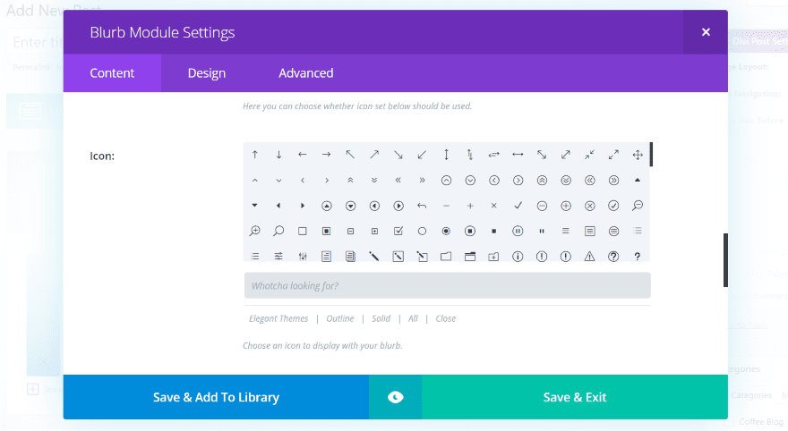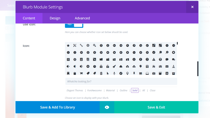 This opens a search box where you can enter what you’re looking for. You can also click on the text under the search box and see icons from Elegant Themes, Outline, Solid, All, or select Close the close the filter. At this point I haven’t enabled Font Awesome or Material Icons.