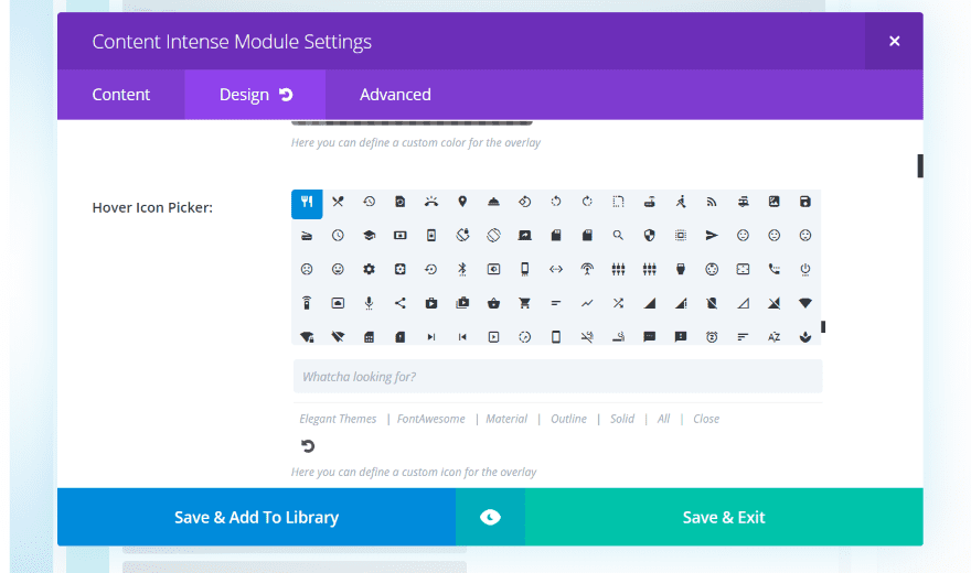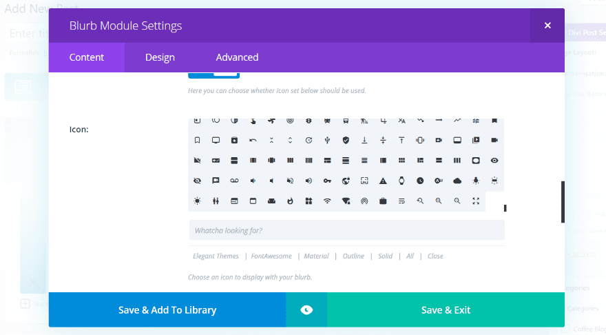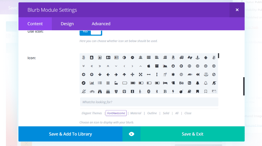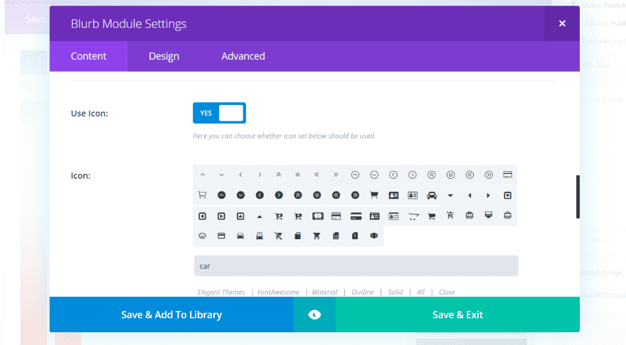 I found the filter useful even without using FontAwesome and Material Icons because it helps sort and find Elegant Themes’ icons, which speeds up development time. Don’t hit the enter key when you search. This will close the module.