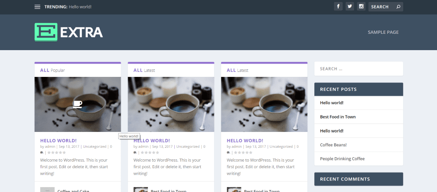 This one is from Elegant Themes’ free Restaurant layout pack. I’ve added an overlay with icon to the blog post images and placed a fork and spoon icon from Material Icons (as you can see in the center image).
