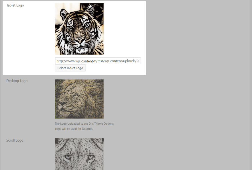 The desktop logo is added in the Divi theme options. All of the other logos are added in this page or on each page individually.