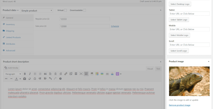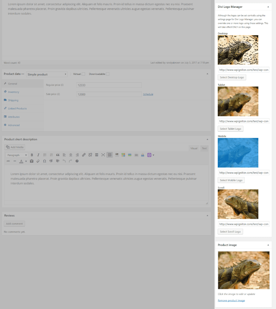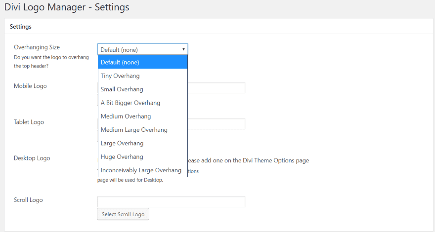 Upload and activate the zipped plugin. Once it’s activated it’s ready to use. All of the work is done in the Settings menu, on the individual pages, and on WooCommerce product pages. In the dashboard, go to Settings and select Divi Logo Manager. From here you can select the overhanging size, mobile logo, tablet logo, desktop logo, and scroll logo.