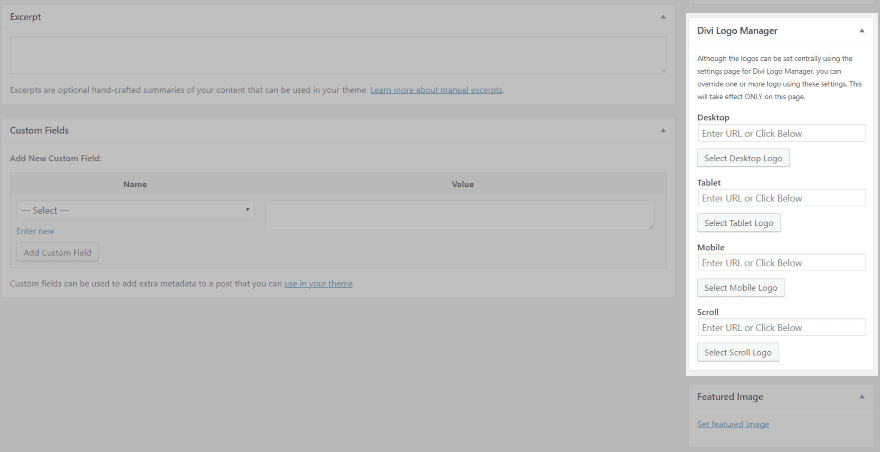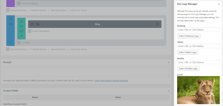 You can select a custom logo that only shows on an individual page that you choose. In the visual editor you’ll see a new customization area to the right called Divi Logo Manager. Here you can select the logos for desktop, mobile, tablet, and scroll on a per-page basis.