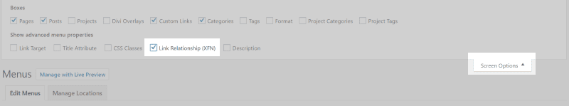 Select Screen Options in the upper right corner and check the box labeled Link Relationship (XFN).