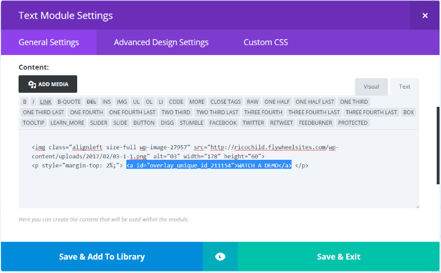 I want to use the text WATCH A DEMO as a link to open the video. To do this, copy the CSS ID from the list of overlays in the dashboard screen.