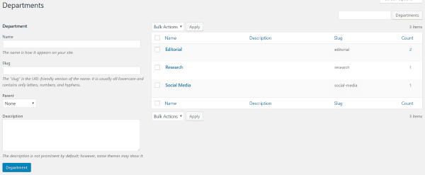The list of Departments works the same as categories. You can get to this screen from the dashboard menu by clicking Staff and then Departments. Here you can create new Departments, add a slug, choose the parent Department, add a description, and edit. It will show the number of team members that are assigned to each department.