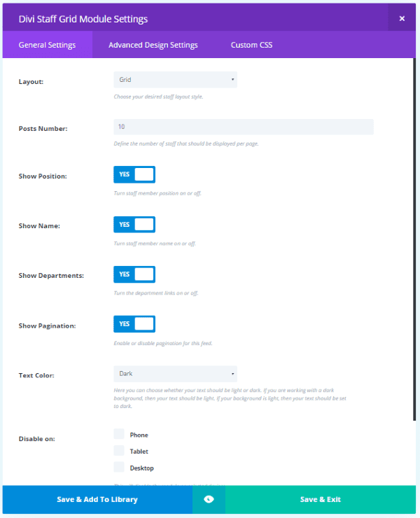 Divi Staff also includes a module that’s added to the Divi Builder. The Grid module works the same as any standard module complete with General Settings, Advanced Design Settings, and Custom CSS. The module displays the number of team members you want in either a grid or a fullwidth view. Once the staff member’s information has been created they are automatically available to display in the module.
