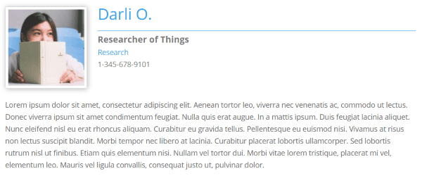 The image above uses the standard WYSIWYG editor. The content at the top (image, name, title, department, and phone number) is from the meta boxes, departments, and the post’s featured image. The lorem ipsum text was added to the WYSIWYG editor.