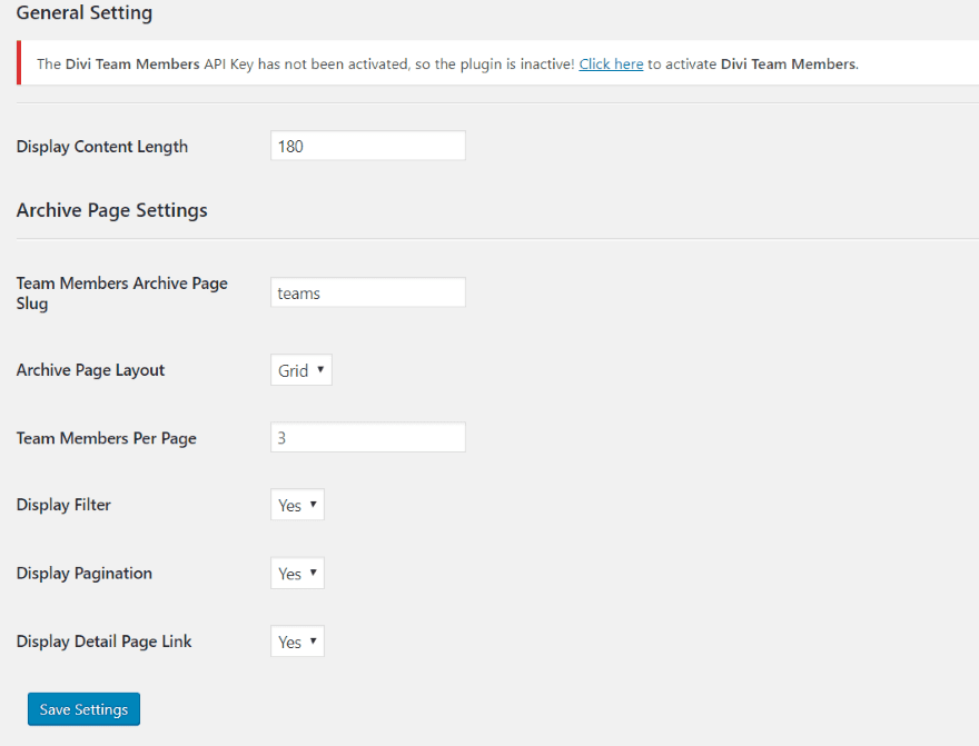 General Settings allow you to set the display length for the content, choose the archive page, set the archive page layout (grid or list), choose the number of members per page, show the filter, pagination, and detail link.