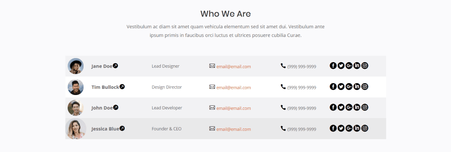 The Team Members Table module displays a table with all of the information on a line. Every other line is a different color. You can style odd and even lines individually. I’m hovering over the bottom team member, which changes color and increases the size of the image on hover.