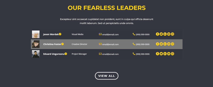 Here’s the Team Members Table module within the Our Work section of the Design Agency layout. I’ve styled the colors to blend with the site, using white for the text and yellow for all of the icons.