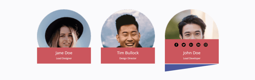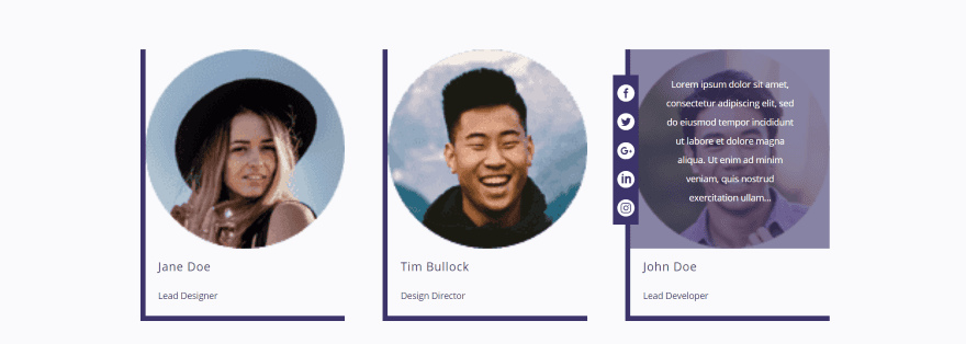 Here’s the same module using Style17 and Random for the team member selection. I’m hovering over the middle team member, which displays the social icons in an overlay. The colors are default.