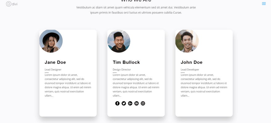 Let’s take a look at Divi Team Members and see what it can do. Images from these examples came from Elegant Themes layouts. I’m using a combination of squared and circled images.