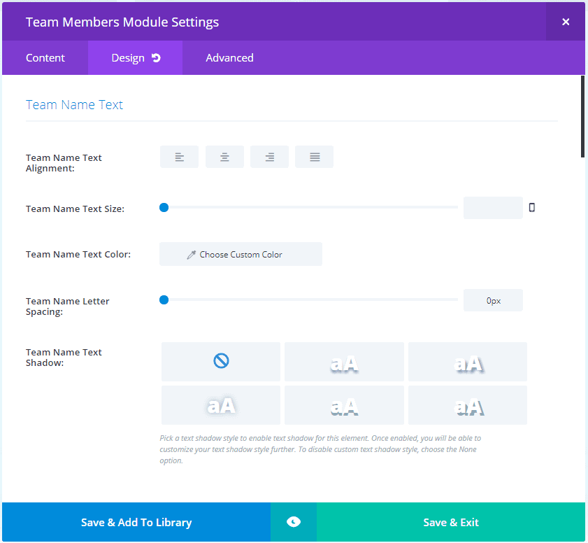 The Design tab includes the team name text, designation name text, description name text, border, box shadow, and animation. Some of the modules include customizations for telephone text and website text. They have basic customizations for the fonts.