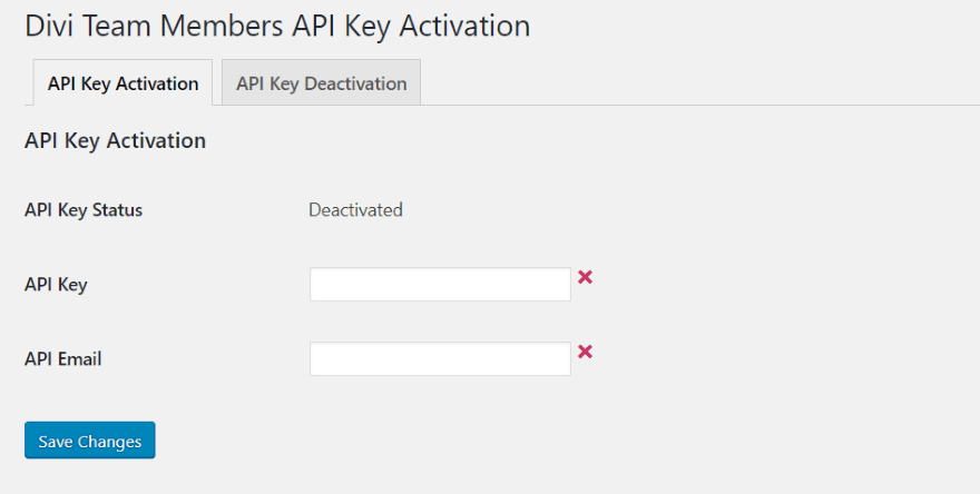 Once you upload and activate the Divi Team Members plugin you’ll need to activate the license. In the dashboard, go to Settings > Divi Team Members, and enter your API key and email.