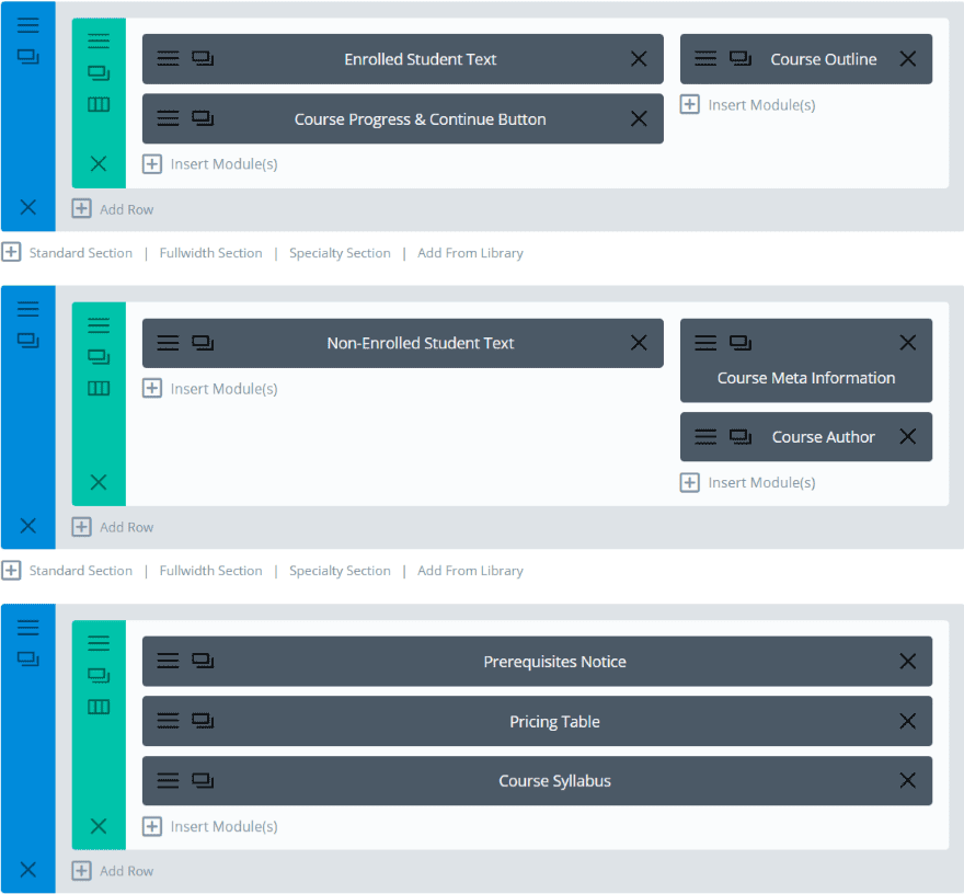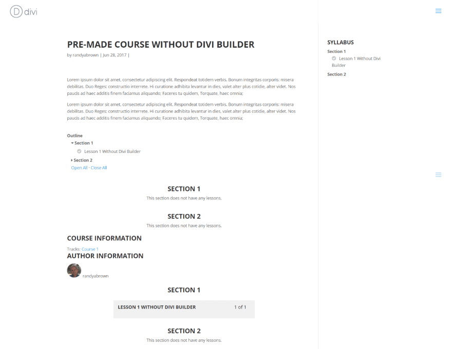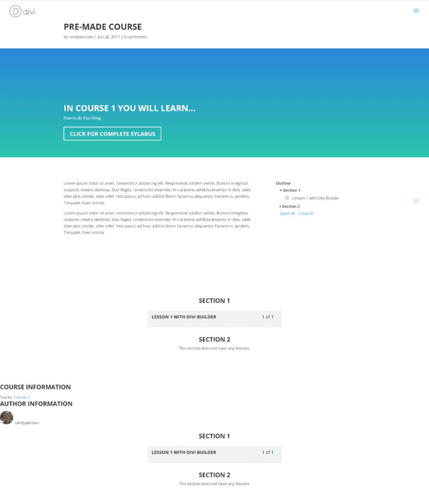Looking back at our original Divi Course page you can see a lot of things added to the bottom of the page. Itâs showing the course outline and course meta for course information and author. Itâs showing Section information twice (pre-requisites, pricing table, and course syllabus) â once within the Divi layout and once within the course information thatâs added to the bottom of the page. They were added by LifterLMS.