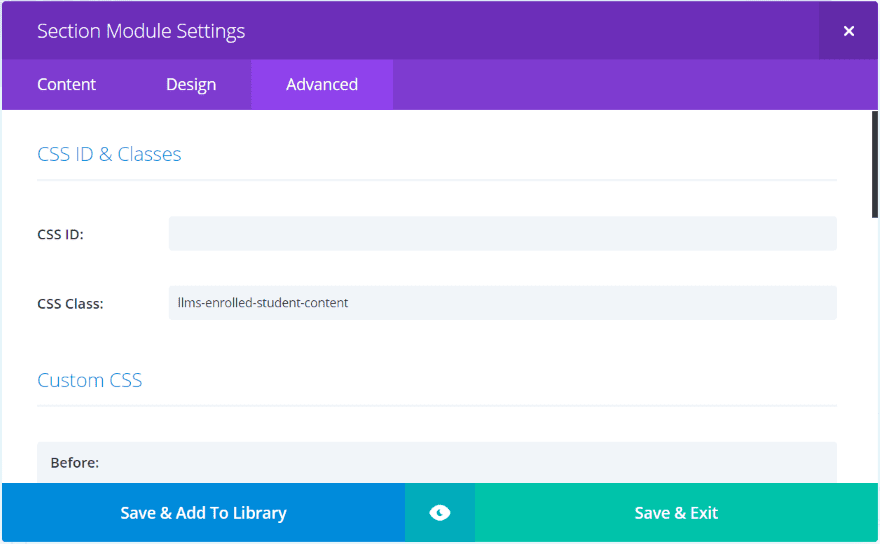 The CSS class is placed within the Advanced tab. You can copy and paste the CSS classes from the LifterLMS website.