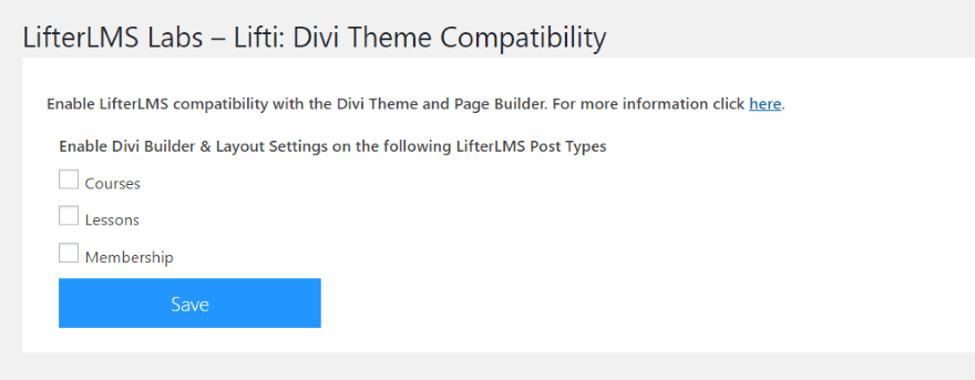 Once youâve enabled Lifti youâll see the screen for Divi theme compatibility. Enable the Divi Builder and Layout settings for LifterLMS post types. The Divi Builder will now be available on those post types.