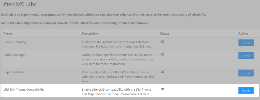 Install and activate LifterLMS Labs as normal. Once you install and activate the LifterLMS Labs youâll need to enable Lifti and then enable to post types you wish to use the Divi Builder on. In the dashboard navigate to LifterLMS and select Labs. Enable Lifit: Divi Theme Compatibility.