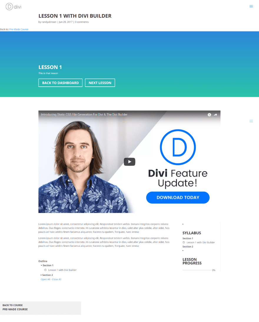 A look at the back end would be really awesome for this example, particularly for the courses section, as each plugin integration with Divi can have its own idiosyncrasies in my experience. Even better would be a walk through video.
