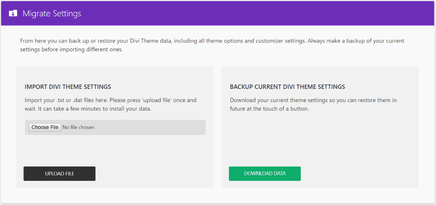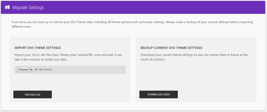 Migrate Divi Theme Settings is simple to use. It doesn’t require any setup and is intuitive. I think beginners wouldn’t have any problems using this plugin. The interface for import and exporting files is labeled well and easy to understand.