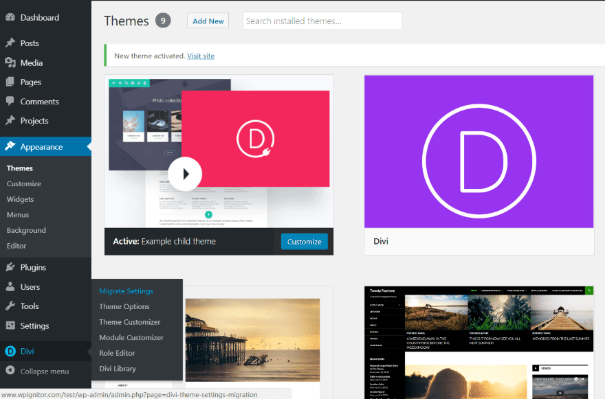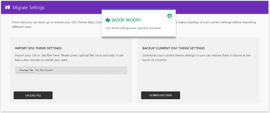 After uploading and activating the child theme, Migrate Divi Theme Settings is now added to the Divi menu in the dashboard, only this time it isn’t a plugin that the user can uninstall. Instead, it’s part of the child theme.