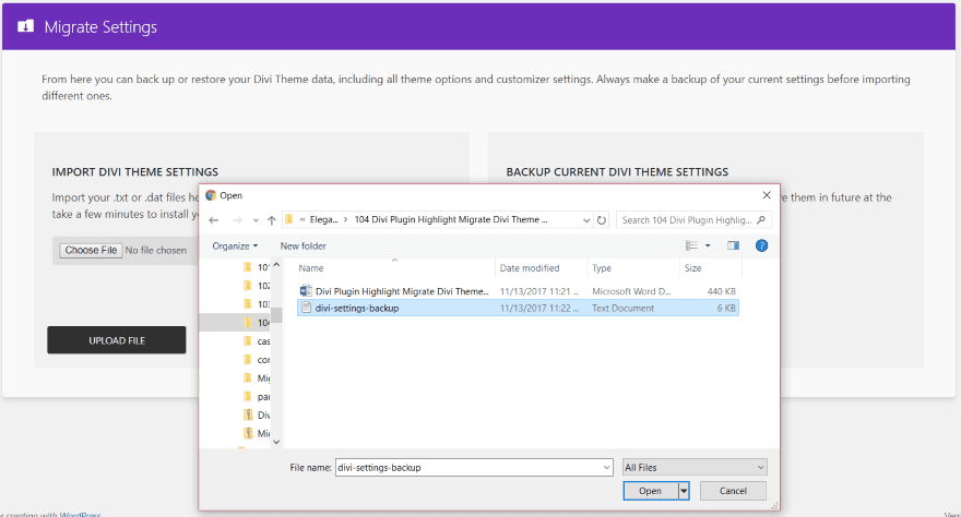 Unless this is a new site with no design elements you want to keep, make a backup before importing files to the website. To import, first install and activate the plugin on the new site and navigate to the plugin’s menu, then click the button labeled Choose File in the section on the left. This will open a window where you’ll navigate to the file. Click on the file and select Open. Click the button labeled UPLOAD FILE.