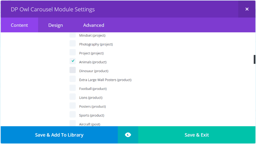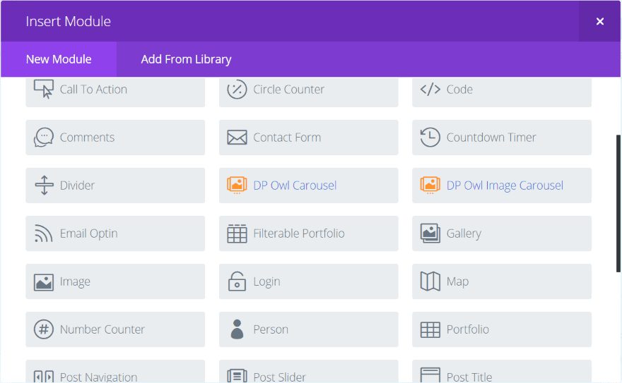Upload and activate the plugin as normal. You’ll then see two new modules in the Divi Builder: DP Owl Carousel and DP Owl Image Carousel. The modules are colored differently than the standard Divi modules to help them stand apart. This is my preference for third-party modules because it makes them easier to find.