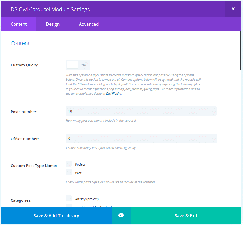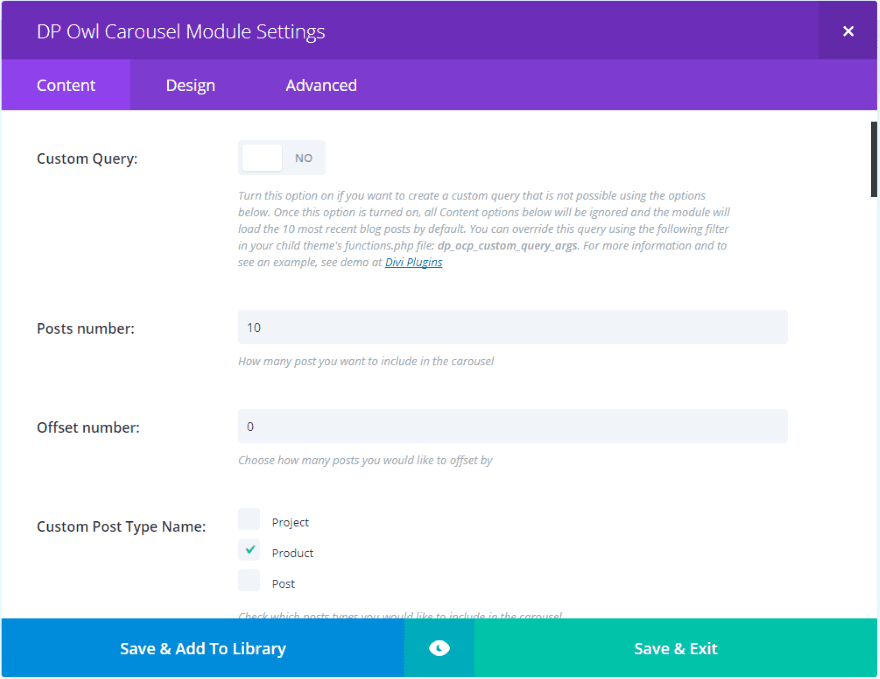 Owl Carousel Pro is a third-party plugin that adds two new modules to the Divi Builder. The first displays post types such as projects, posts, and custom post types. The second is an image carousel compete with visual editor to add any type of content you want.