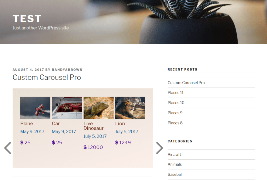 I now have a product carousel that shows off the WooCommerce categories that I selected. I selected to show 4 posts, increased the image size, changed the font colors for the title, meta, and custom fields, and increased the font sizes for the title and custom fields. In this example I’m only showing the date for meta, but just like regular posts I could show any of the meta information and an excerpt.