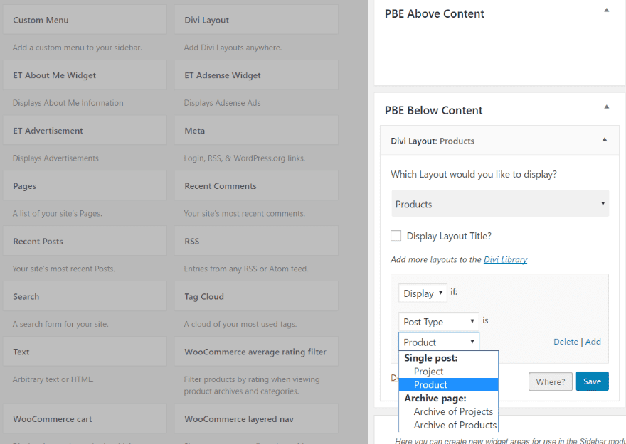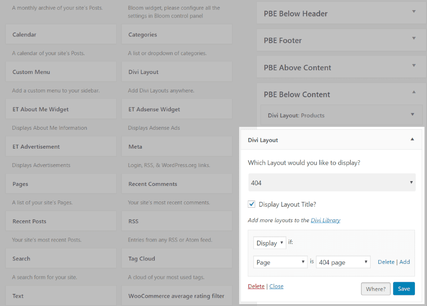 I then placed the widget, selected the layout, and chose the conditions for it to display only on the 404 page. Notice the widgets of the Product pages are still in place. The conditions keep them from showing where I don’t want them to.