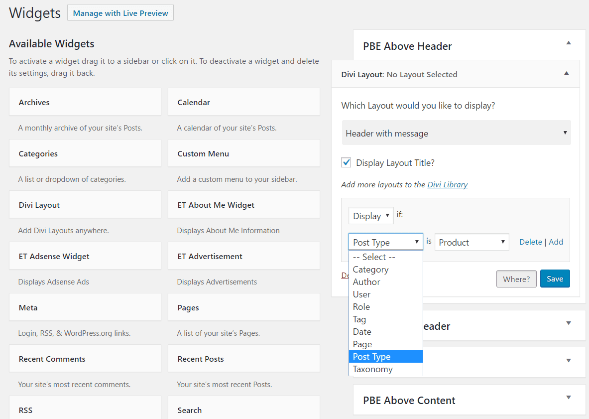 The widget lets you use conditional logic so you can decide when the layout appears. I selected Header with message and clicked Where. This brings up the conditional logic so you can choose whether to display or not, select the post type, and choose the result from drop-down boxes. You can add as many conditions as you want. They use OR logic, so it will display IF This = That OR this = That OR…
