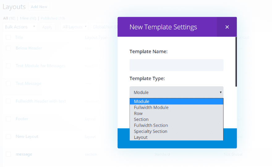 The plugin uses your premade Divi layouts, so you’ll need to create them first. Go to Divi, Divi Library in the dashboard and select Add New to create your layouts. You can create the layouts using Module, Fullwidth Module, Row, Section, Fullwidth Section, Specialty Section, or Layout.