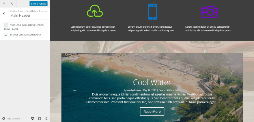 Choose Remove Default Main Header to hide the original header. The features for the main header work for both above and below the header areas.
