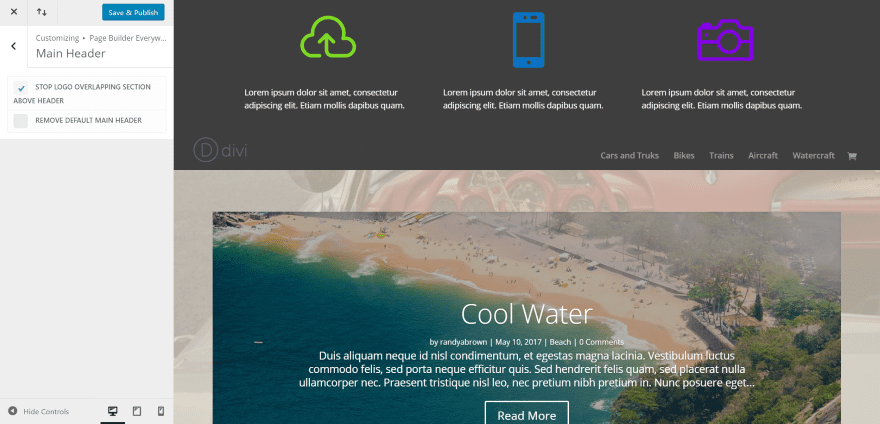 As you can see in the example for above the header, the logo overlaps the sections of above the header and the header. You can keep this from overlapping and leave the logo in its original location by selecting Stop Logo Overlapping Section Above Header.
