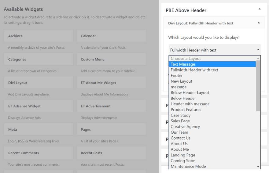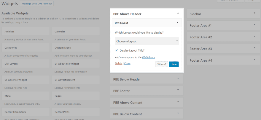 Once you’ve created the layout you want, drop the Divi Layout widget into the location you want it to appear and choose the layout from the drop-down box. If you haven’t created the layout you can click the link labeled Add more layouts to the Divi Library and it will take you to the library.