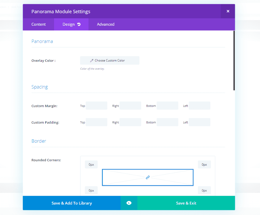 A new module is added to the Divi Builder called Panorama. It’s dark blue and includes the publisher’s logo, so it stands out nicely.