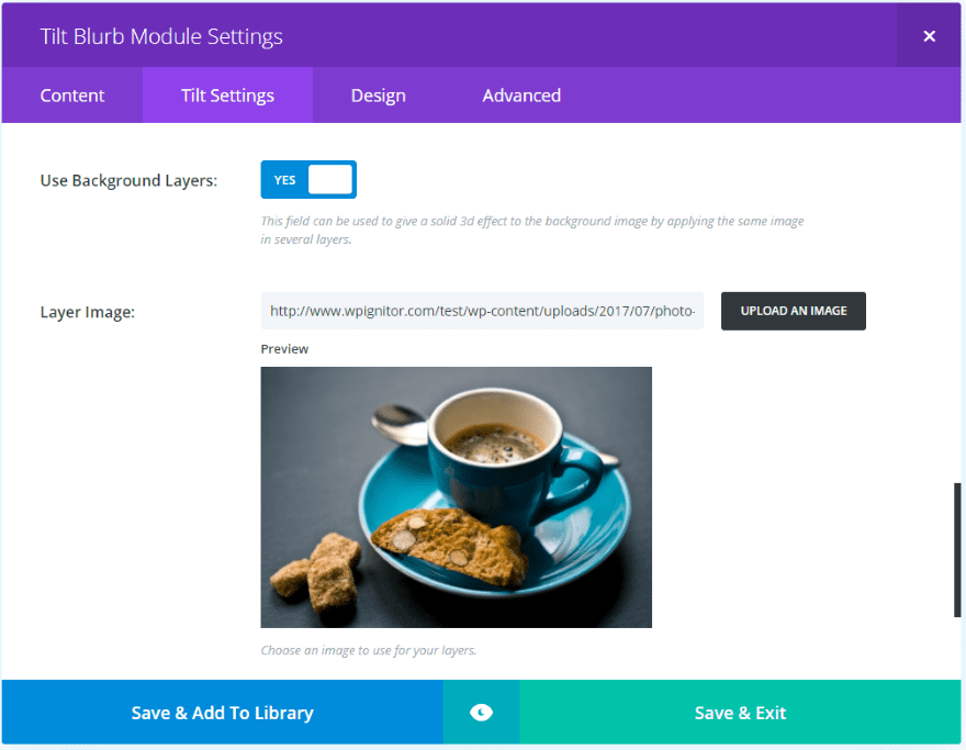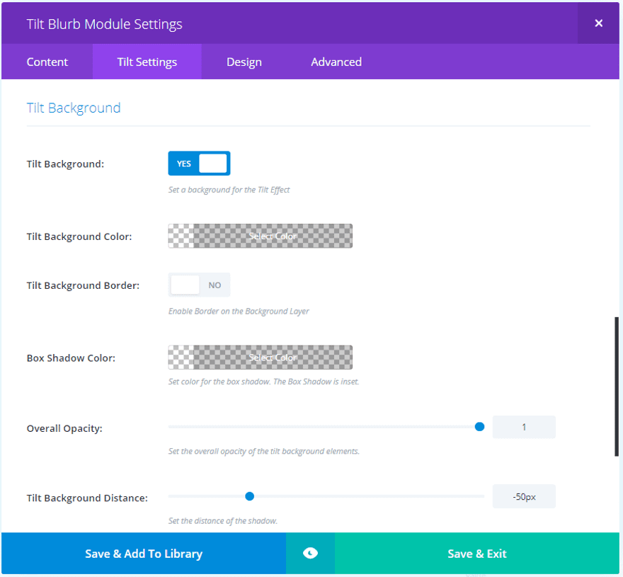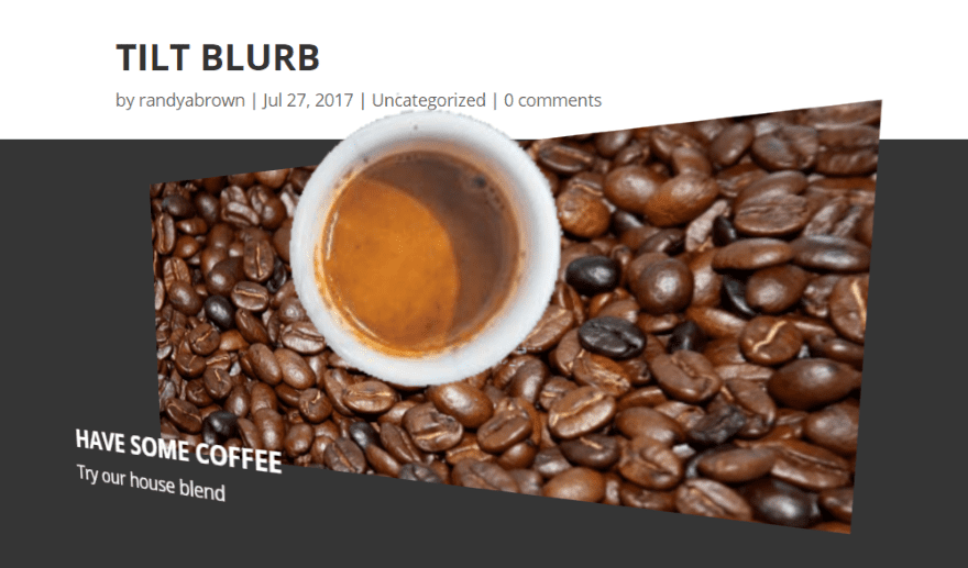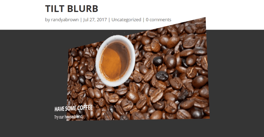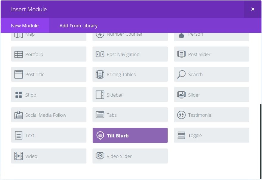 A new module is added to the Divi Builder called Tilt Blurb. It’s colored purple within the Divi Builder so it’s hard to miss. I like when developers use different colors for their modules so they stand out from the standard modules (for what it’s worth).